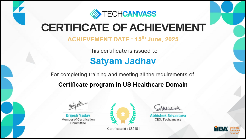 This certificate was issued to Satyam Jadhav on 15 June 2025.