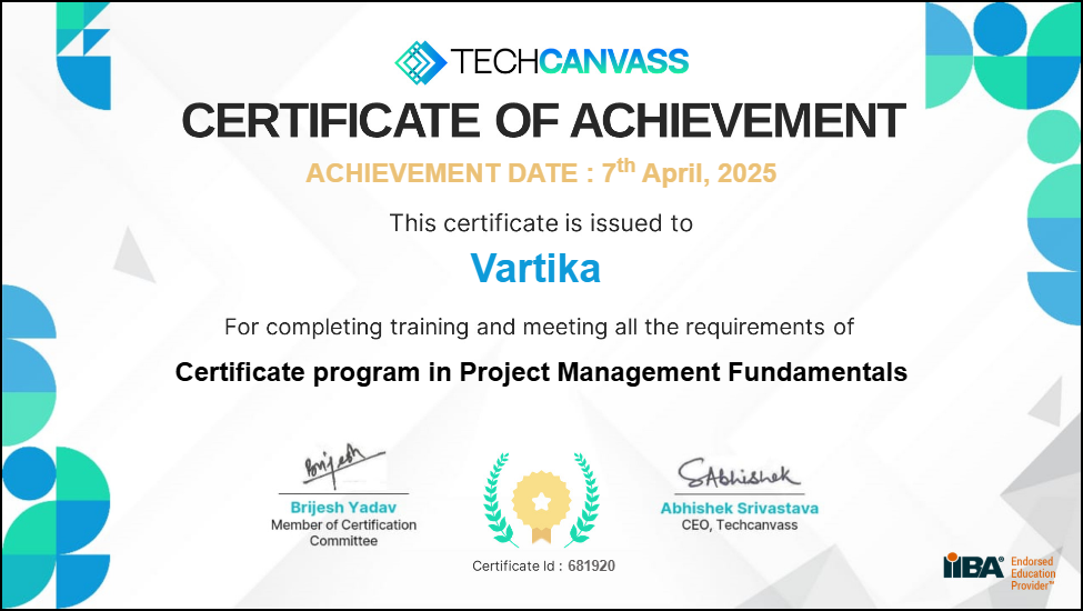 This certificate was issued to Vartika  on 07 April 2025.
