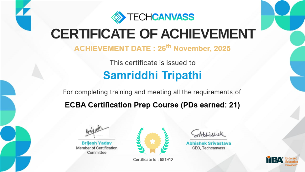 Techcanvass is an Information Technology certifications training Organization for professionals. It offers internationally recognized certifications in the field of Business Analysis. It is a premier Authorized training partner (ATP) of a premier Endorsed Education Provider (EEP) of International Institute of Business Analysis (IIBA), Canada.