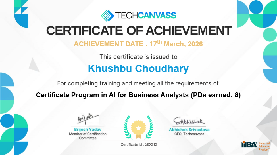 Techcanvass is an Information Technology certifications training Organization for professionals. It offers internationally recognized certifications in the field of Business Analysis. It is a premier Authorized training partner (ATP) of a premier Endorsed Education Provider (EEP) of International Institute of Business Analysis (IIBA), Canada. Founded by IT professionals, Techcanvass is committed to make learning a more structured, practical and goal-oriented exercise. We also provide consulting services in the field of Business Analysis.